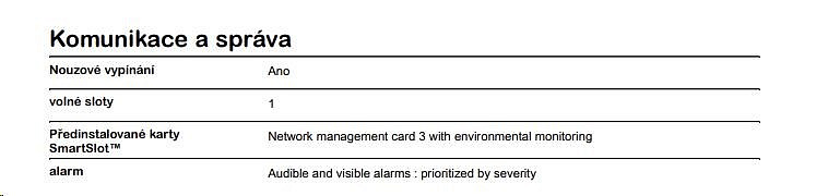 | Obsah dodávky | CD so softvérom, Disk CD s dokumentáciou, Inštalačná príručka, Záručná karta EPO Terminálny blok, Tepelný senzor, USB kábel, RJ45-DB9 kábel, Console-DB9 kábel, 2 ks káblov 2m C19-C20, Odnímateľná podpora, Rack montážne úchyty |