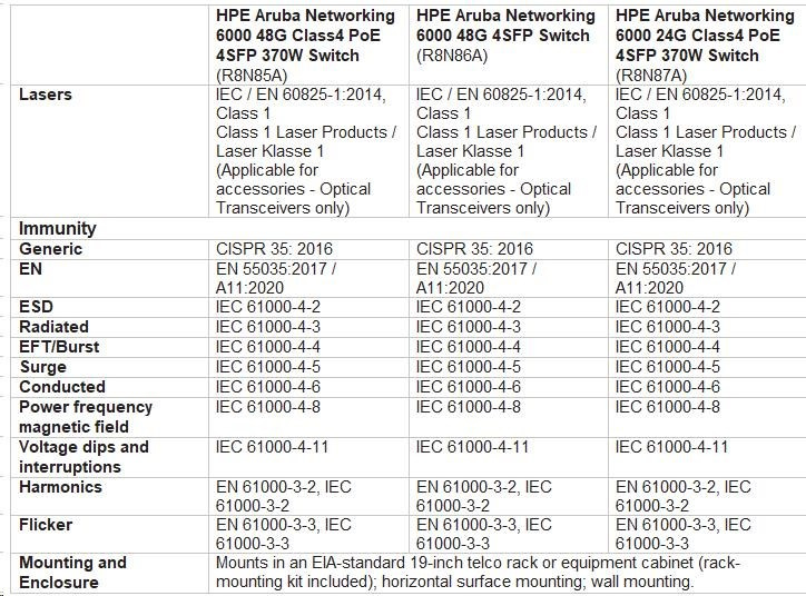 Emissions | VCCI-CISPR 32, Class A; CNS 13438; ICES-003 Issue 6 Class A; FCC CFR 47 Part 15, Class A; EN 55032: 2015 +AC:2016 / CISPR-32, Class A |