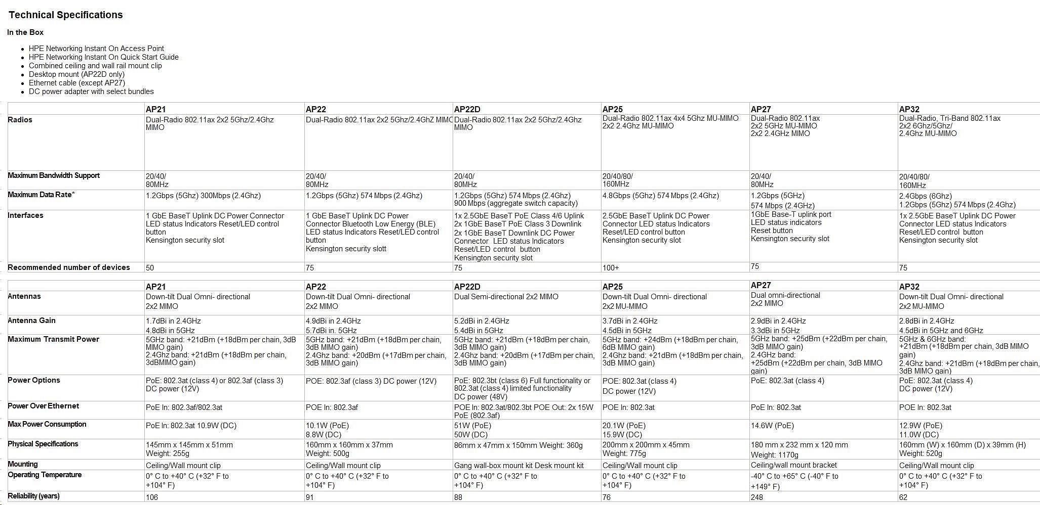 | Ultra-high-speed performance for high-density small businesses. Perfect for gaming, boutique hotels, tech start-ups and professional offices. The rise of the remote and hybrid workplace has placed increased pressure on business networks. Existing Wi-Fi infrastructure is struggling to support the explosion of devices and bandwidthhungry applications - all contributing to spotty video calls and sluggish download speeds. The Aruba Instant On AP25, a 4x4 Wi-Fi 6 access point, is designed to meet the increasing volume of connected devices. Delivering superior performance, coverage, and speed at a competitive price, the AP25 is the perfect access point for small and growing businesses. The Wi-Fi Certified 6TM AP25 delivers faster Wi-Fi speeds, greater capacity, and reduced latency between access points and devices for a superior Wi-Fi experience. AP25 improves efficiency and reduces congestion for networks with many connected devices, making it ideal for high-density environments. And with 4x the capacity of 802.11ac access points, the AP25 provides exceptional user experience, allowing businesses to serve more customers with higher speed and less congestion. Features of the AP25 include orthogonal frequency-division multiple access (OFDMA), multi-user MIMO and target wake time (TWT). With up to 4 spatial streams (4SS) and 160MHz channel bandwidth (HE160), the AP25 provides groundbreaking wireless capabilities for businesses looking to boost performance and future-proof their networks. |