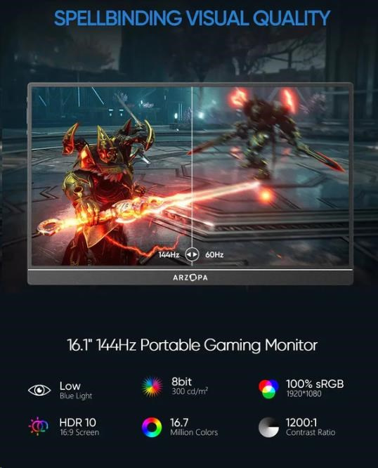 Monitor Arzopa Z1FC nabízí působivou úhlopříčku 16,1 palce podpořenou obnovovací frekvencí 144 Hz, která zaručuje plynulý obraz i v těch nejdynamičtějších scénách. Díky jasu 250 cd/m2 a širokému barevnému gamutu 100 % sRGB se obraz vyznačuje výjimečnou hloubkou a intenzitou barev. Vysoký kontrastní poměr 1200:1 a paleta 16,7 milionu barev (8 bitů) navíc zajišťují ostrý a detailní obraz.