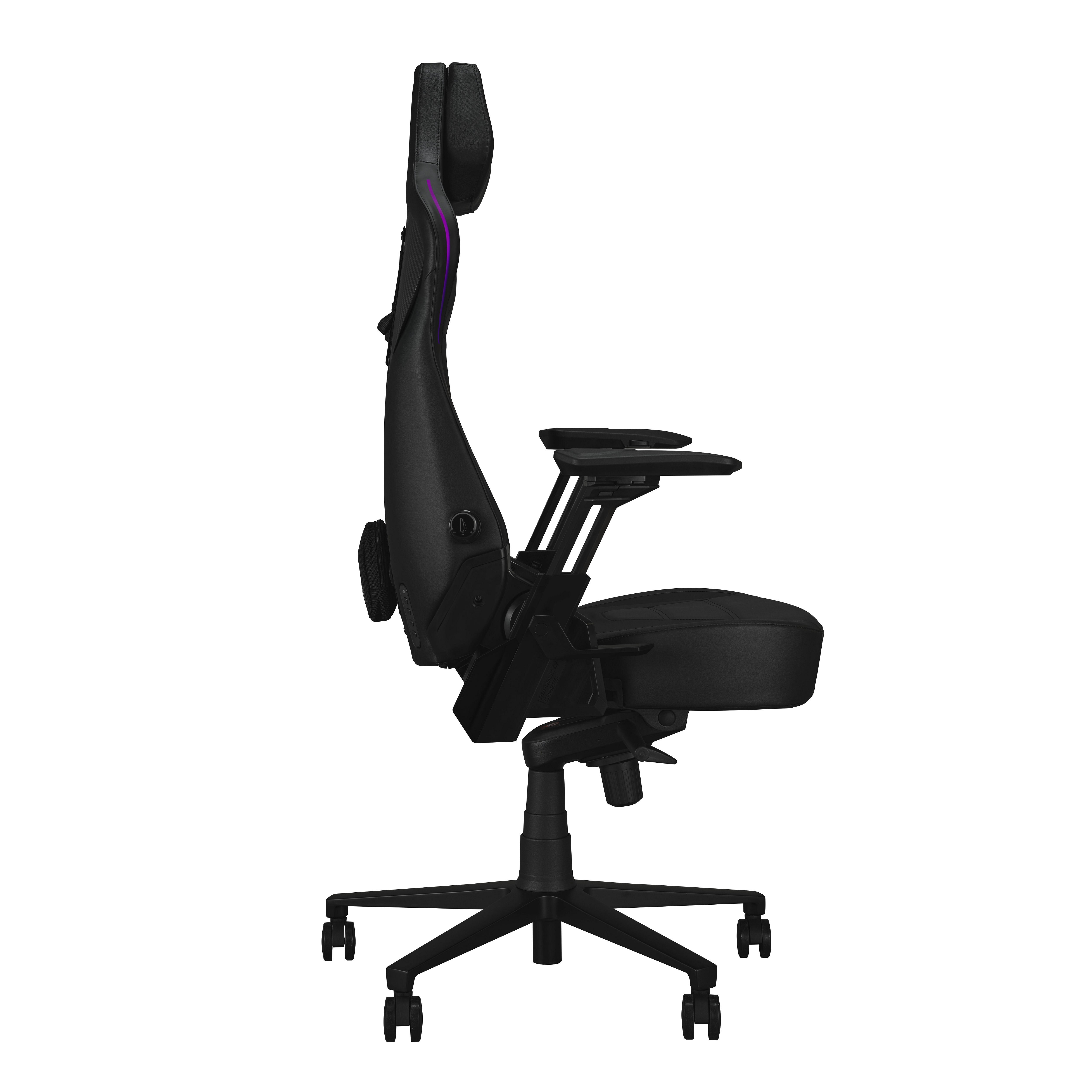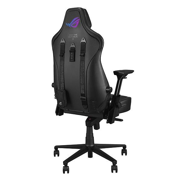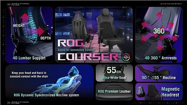 Herní židle ROG Courser s nastavitelnou bederní opěrkou lisovanou za studena pro podporu a proudění vzduchu, 4D područkami, ultraširokým sedákem, magnetickou opěrkou hlavy, dynamickým synchronizovaným systémem sklápění a osvětlením Aura RGB