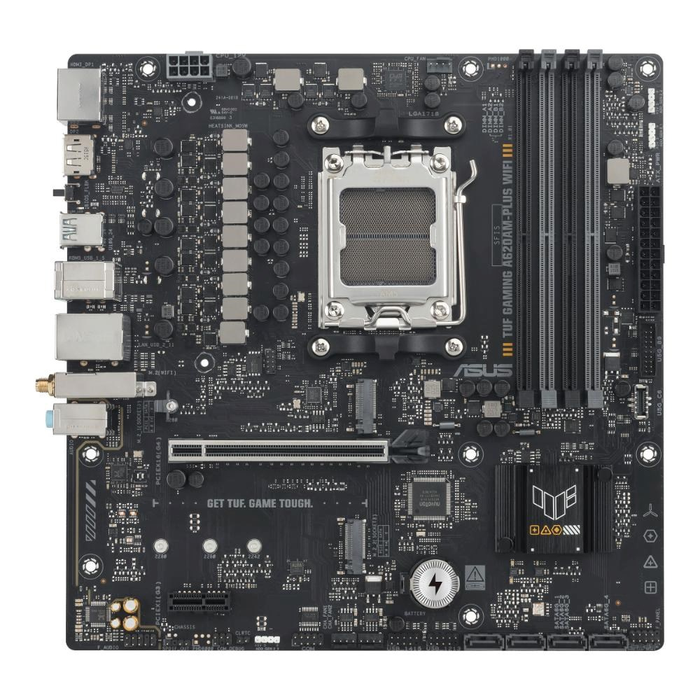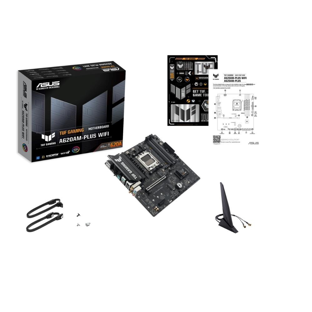 ASUS TUF GAMING A620AM-PLUS WIFI obsahuje všetky základné prvky najnovších procesorov AMD Ryzen™ a kombinuje ich s hernými funkciami a overenou odolnosťou. Navrhnutá s vojenským hardvérom, vylepšeným napájacím systémom a komplexným chladením, táto základná doska prekonáva očakávania spoľahlivým a stabilným výkonom pri maratóne hrania. TUF GAMING základné dosky tiež podstupujú prísne testy odolnosti, aby sa zabezpečilo, že zvládnu podmienky, v ktorých iné môžu zlyhať. Táto platforma poskytuje výkon a pripojenie, ktoré požadujú pokročilé AI PC aplikácie.