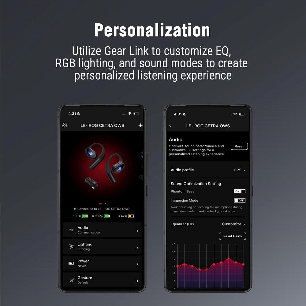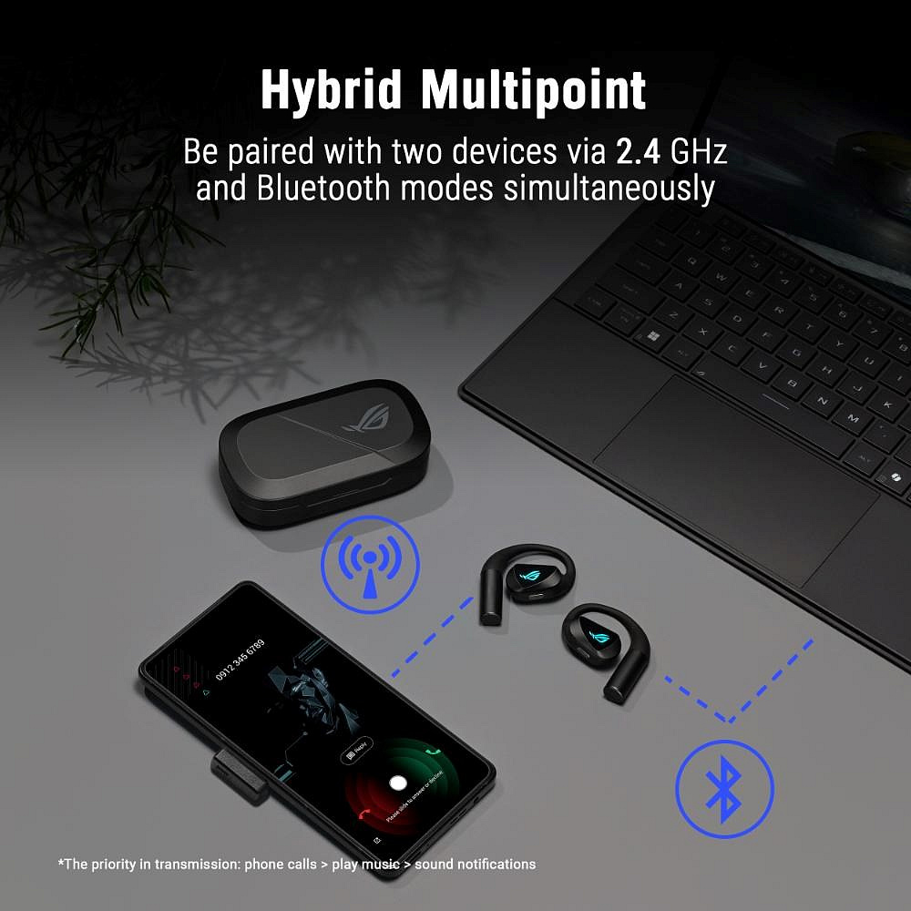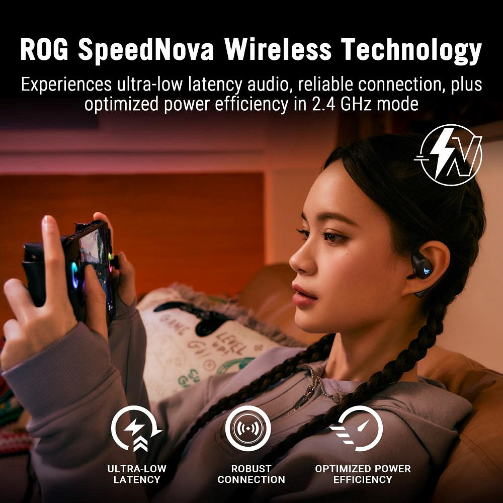 Herní sluchátka ROG Cetra Open Wireless s bezdrátovým připojením ve dvou režimech (Bluetooth a ultra-nízkolatenční technologie ROG SpeedNova 2,4 GHz), jednosměrným průchozím nabíjením přes USB-C, 14,2mm měniči Diamond-Like Carbon, otevřenou konstrukcí (open-ear), odnímatelným řemínkem na krk a čtveřicí mikrofonů s AI potlačením hluku.