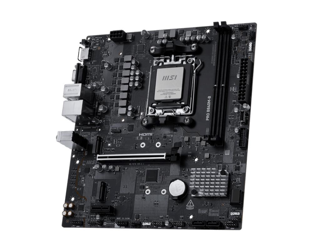 PRO B840M-B je navrhnutý s mnohými exkluzívnymi funkciami MSI, PCIe 4.0 M.2, EZ PCIe Clip II, LAN 2,5G a Front Type-C, pripravený na procesory AMD Ryzen 9000 série.