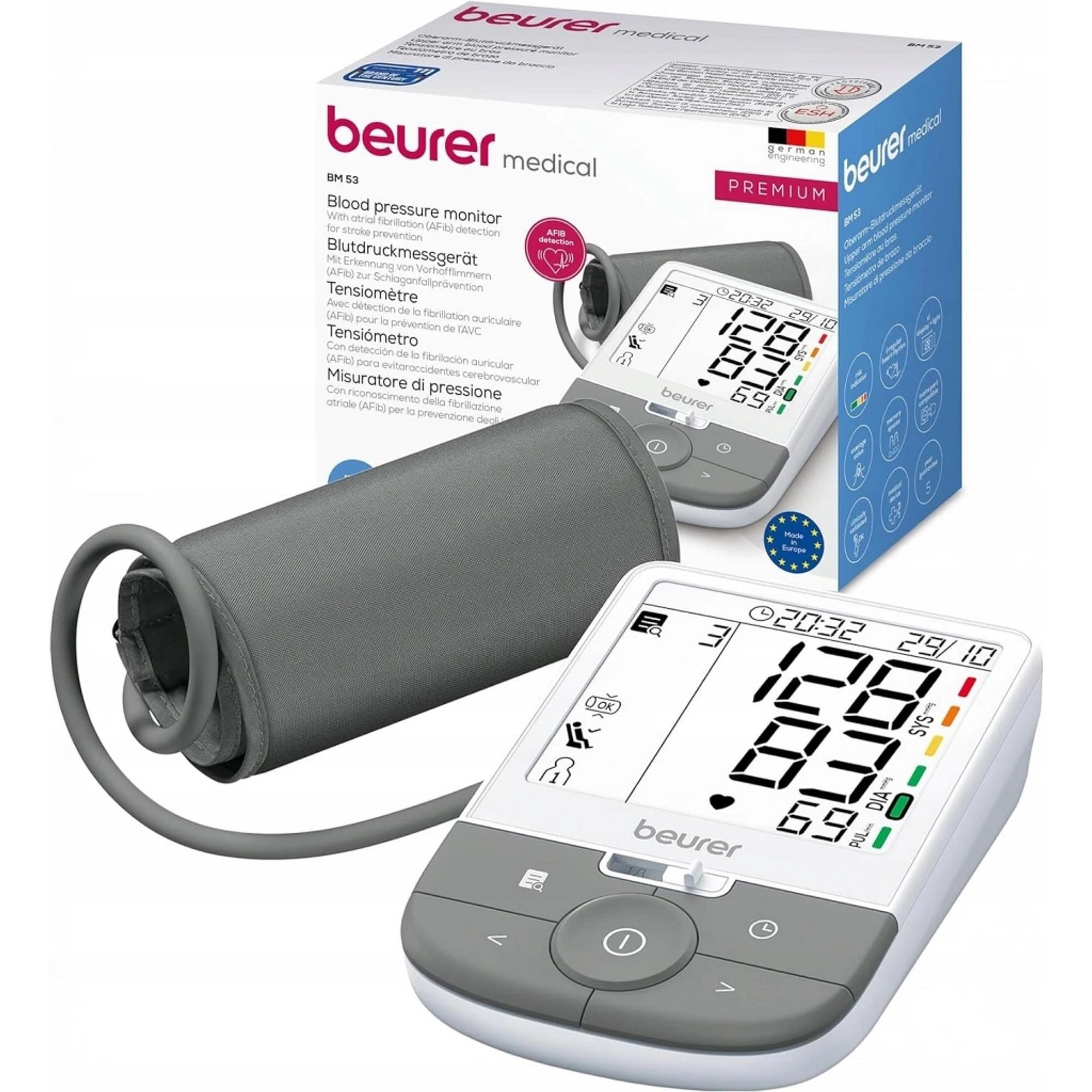 Beurer BM 53 pracuje metodou oscilometrického automatického měření, které poskytuje spolehlivé hodnoty tlaku i tepu. Přístroj také nabízí detekci arytmie, takže vás upozorní na nepravidelnosti srdeční činnosti, které stojí za další kontrolu u lékaře.