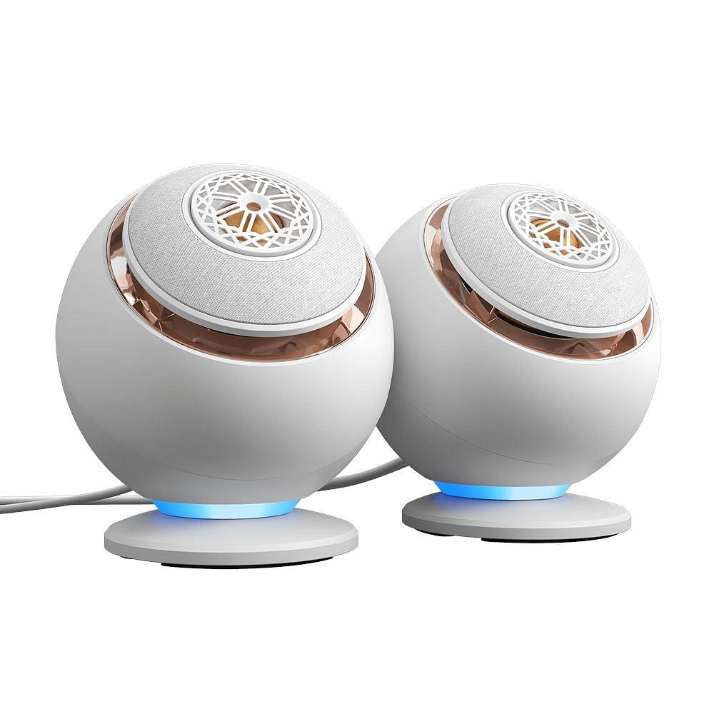 Creative Pebble Nova sú dizajnové reproduktory, ktoré kombinujú elegantný vzhľad s výkonným zvukom. Vďaka inovatívnemu koaxiálnemu usporiadaniu meničov s pasívnymi záriči poskytujú bohatý a plný zvuk naprieč celým rozsahom hlasitosti. Ponúkajú špičkový výkon až 100 W a frekvenčný rozsah od 55 Hz do 20 kHz. Zabudované dynamické RGB podsvietenie dodá vašej zostave štýl a atmosféru. Pripojenie je možné cez USB-C, Bluetooth 5.3 alebo 3,5mm AUX-in, čo zabezpečuje maximálnu flexibilitu a kompatibilitu s širokou škálou zariadení. Reproduktory je možné umiestniť buď priamo na základňu, alebo zvýšiť pomocou priloženého stojana.