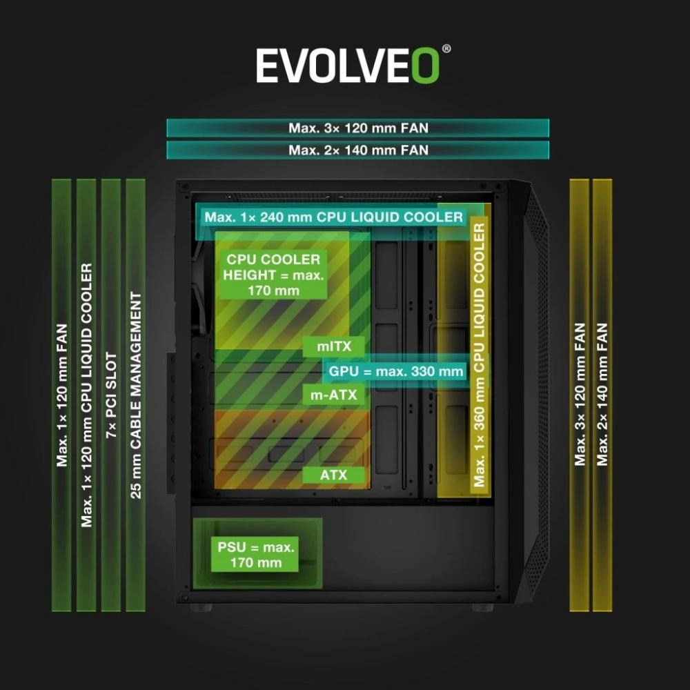 Na první dobrou byste možná řekli, že počítačová skříň o rozměrech 204 × 420 × 355 mm a hmotnosti 4,5 kg nemůže nabízet nic extra. Jenže to by nesměla být řeč o EVOLVEO Xenon-BK-4 – počítačové skříni, u které je přijatelná velikost v dokonalé rovnováze s velkorysostí vnitřního prostoru. Její zásluhou se vám stolní počítač bez problému vejde na stůl i do skromného herního koutku, ovšem do nitra skříně se vejde vše, co si vaše neskromné herní ambice žádají.