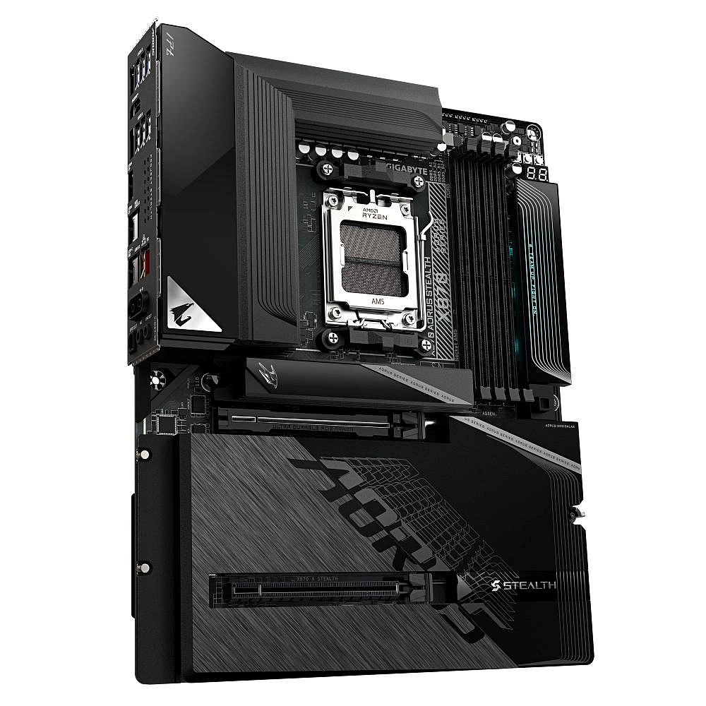 The GIGABYTE X870 AORUS STEALTH is an ATX form factor motherboard built on the AMD X870 chipset with the AM5 socket. It is designed for AMD Ryzen™ 9000, 8000, and 7000 series processors. Its defining feature is a design where all primary connectors are located on the back of the PCB.