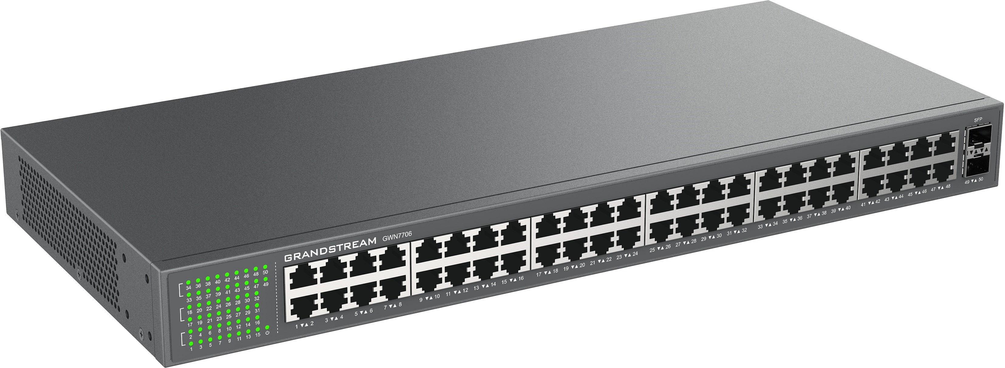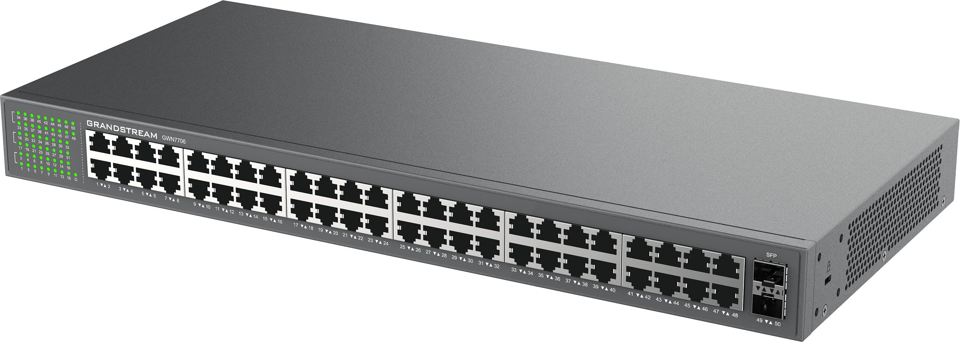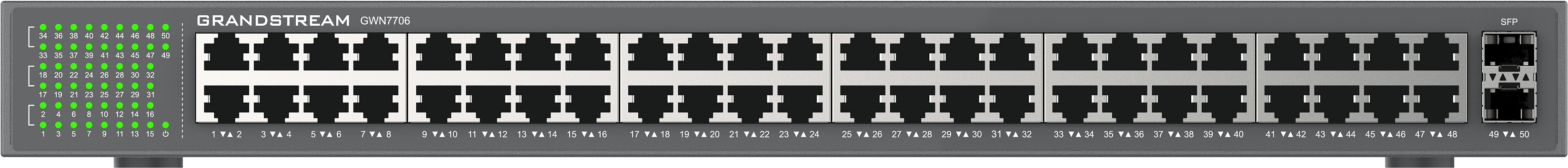 5/8/16/24/48 gigabitových portů RJ45, 4 porty PoE+ (GWN7700P a GWN7701P), 8 portů PoE+ (GWN7701PA a GWN7702P)