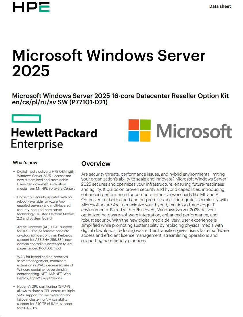 HPE Windows Server 2025 16-core Datacenter Reseller Option Kit (CZ EN Russia Pol Swe)