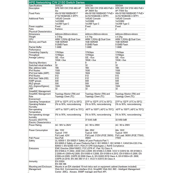 HPE Networking CW 2150 48p 10M/100M/1G PoE+ 4p SFP+ 1G/10G 770W Switch.