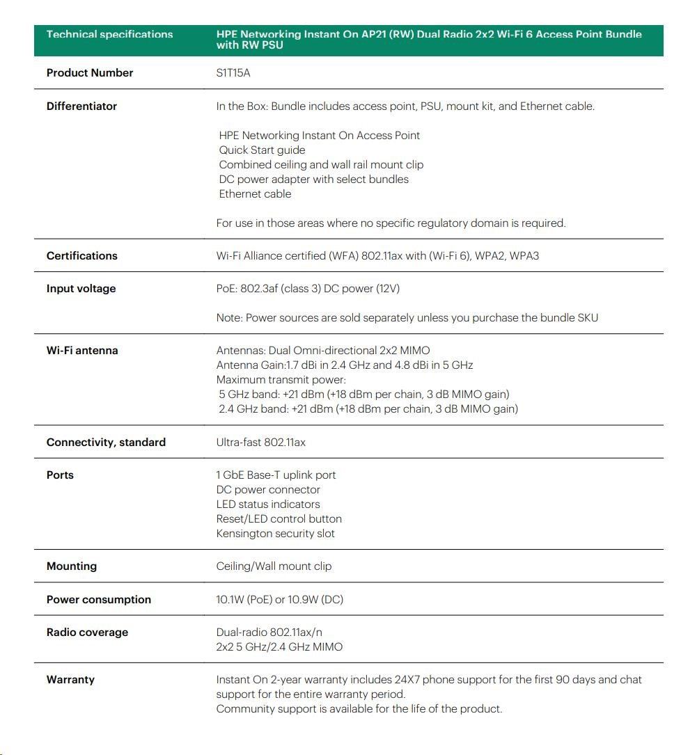 HPE Networking Instant On AP21 (RW) Dual Radio 2x2 Wi-Fi 6 Access Point Bundle with RW PSU