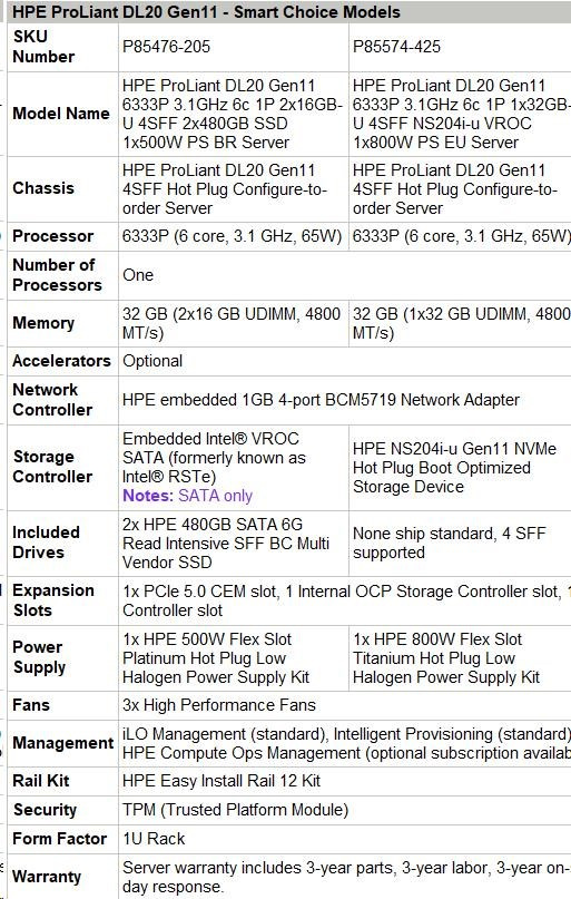 HPE PL DL20 gen11 6333P (3.1G/6C12T) 1x32G (P64339) 4SFF NS204i-u (2x480Gnvme) VROC 1x800W 4x1G NBD333 Smart Choice.
