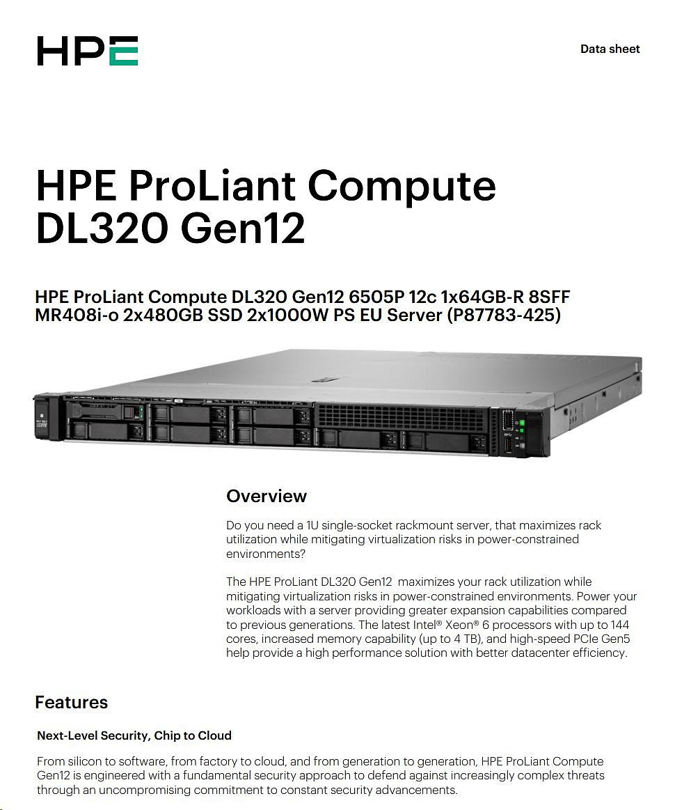 Prevedenie servera:Rack, 1U Rack; Typ procesora:Intel 12 Core Xeon; Počet slotov PCIe:2; Hot-plug cage pre HDD:2.5" SFF; RAID:1, 5; Redundantný zdroj; Počet inštalovaných HDD:2; Výška servra:1U.