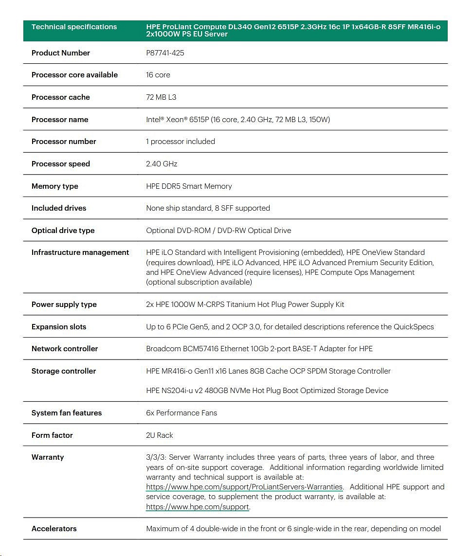 HPE PL DL340 Gen12 6515P (2.4/16C) 1x64G (P69728) NS204(2x480) MR416i-o 8SFF 2x1000W 10GbE NBD333 Smart Choice.