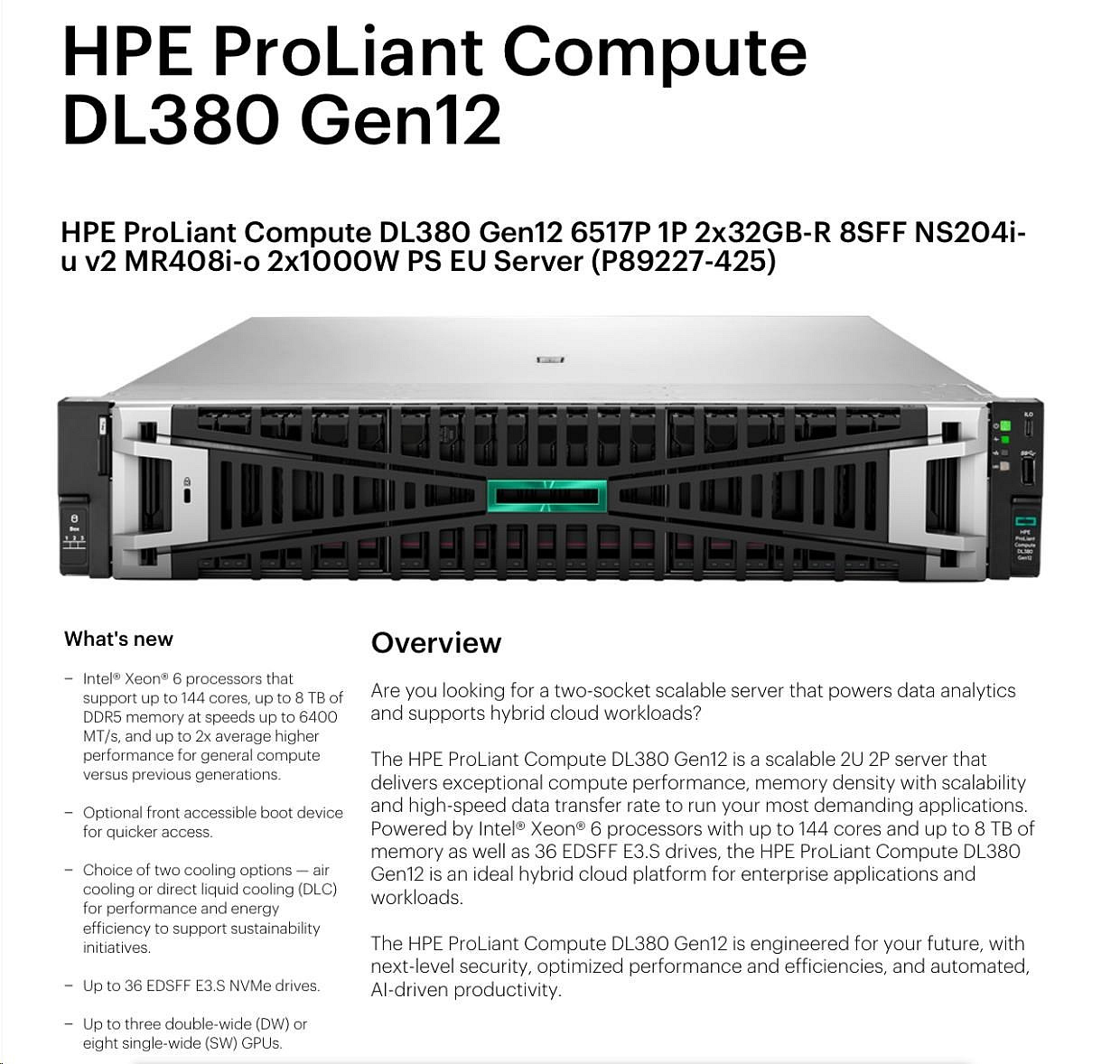 HPE PL DL380g12 6517P (3.2-4.2G/16C) 4x32G (P69727) 8SFF NS204i-uv2 MR408i-o 2x1000W 2p10T NBD333 Smart Choice