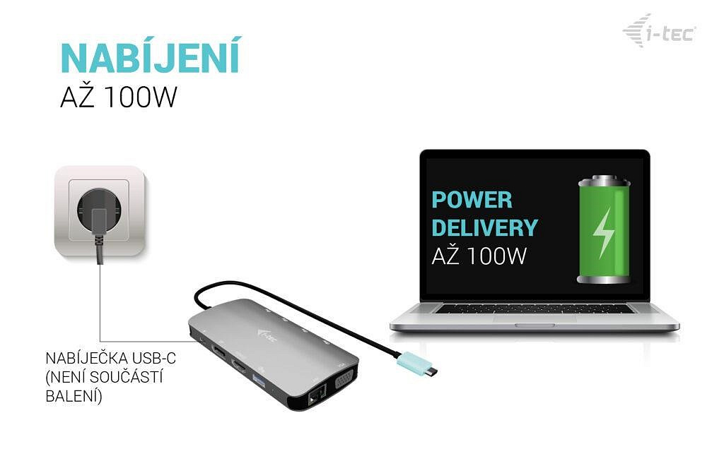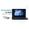 Samozřejmostí je podpora napájení přes USB-C Power Delivery až 100 W**, takže můžete svůj notebook nebo tablet nejen připojit, ale zároveň i nabíjet – vše jedním kabelem.