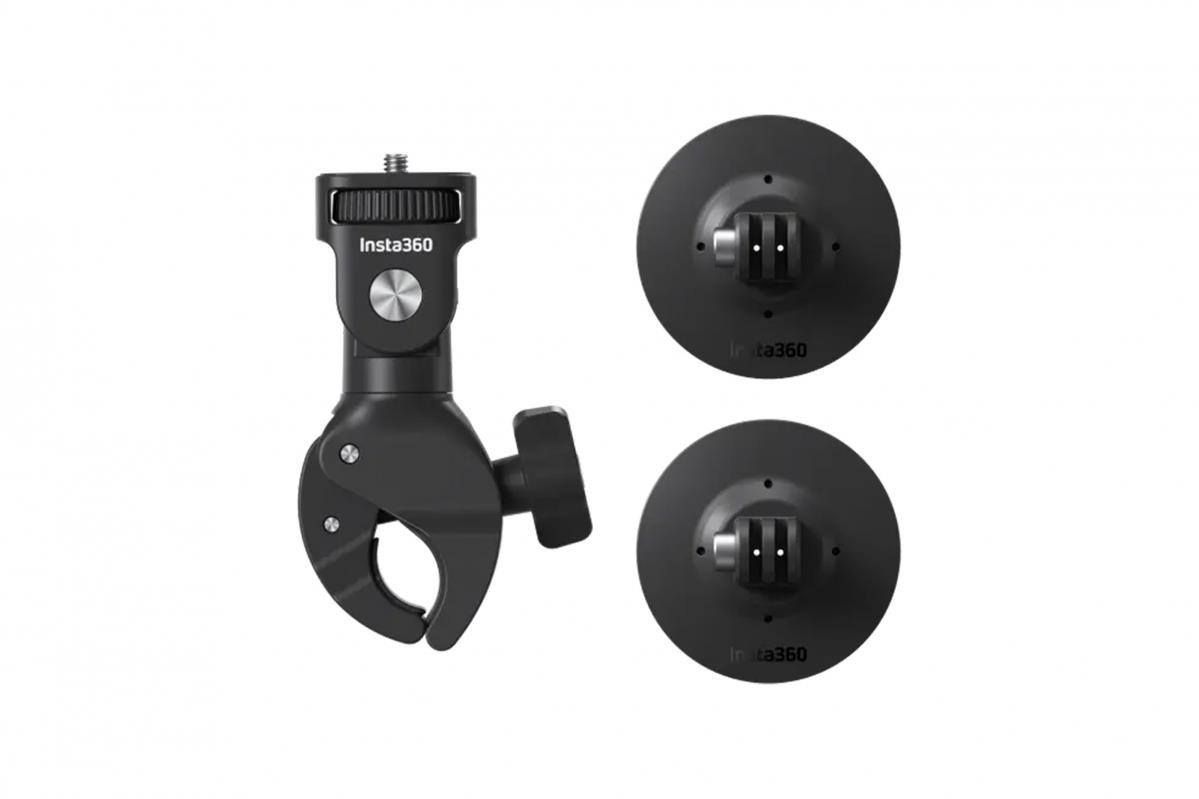 Montážna sada kamery na motorku Insta360. Obsahuje objímku na riadidlá, dva samolepiace držiaky na prilbu, dva adaptéry so statívovým závitom, adaptér s vnútorným statívovým závitom, poistné šrouby a plastové vložky. Súčasťou sady je aj šesťhranný kľúč a utahovací nástroj.