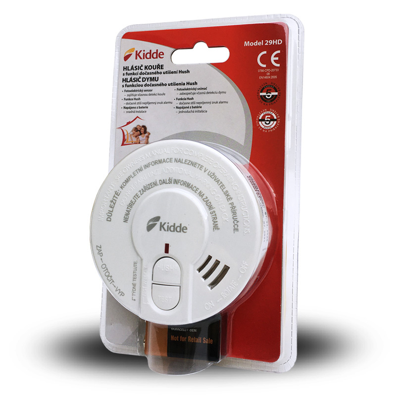 Hasiaci prístroj je vybavený testovacím tlačidlom TEST na kontrolu správneho fungovania zariadenia a HUSH na krátkodobé umlčanie požiarnej signalizácie v prípade planého poplachu. Stlačenie tlačidla spôsobí okamžitú deaktiváciu alarmu na približne 10 minút, zníženie citlivosti obvodov a vypnutie akustickej signalizácie hlásiča. Tlačidlo HUSH používajte iba v prípade, že poznáte príčinu aktivácie hlásiča (napr. pri varení alebo smažení). Po cca 10 minútach od deaktivácie sa hlásič automaticky resetuje do pôvodného nastavenia na monitoring požiarneho nebezpečenstva. Ak v miestnosti zostane vysoká koncentrácia koure, môžete tlačidlo HUSH opakovane stláčať, až kým miestnosť nebude riadne vyvetraná. Tento model je vybavený najmodernejším fotoelektrickým senzorom Kidde.