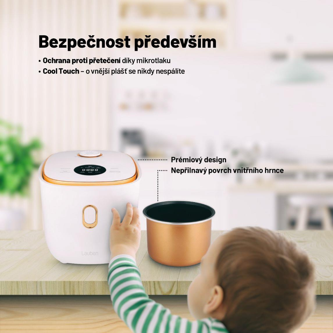Efektivita, jednoduché použitie a dizajn majú spoločného menovateľa, je ním viacúčelový ryžovar Lauben Multifunction Rice Cooker 1200WR Rose Gold Edition. Stlačením jediného tlačidla uvarí všetky druhy ryže na správnu tvrdosť a 6 prednastavených funkcií vykúzli ďalšie pokrmy ako kaša alebo polievky. Čas niektorých programov si však na intuitívnom dotykovom displeji môžete nastaviť aj manuálne. Vďaka funkcii odloženého štartu je možné mať jedlo pripravené už po návrate domov, oneskorenci zase ocenia funkciu Keep Warm, ktorá udrží pokrm teplý bez rozvarenia. Porcie nasýtia jednotlivcov i páry, ktoré potom majú viac času pre seba, pretože ani údržba nezaberie čas. Vnútorný hrniec je možné dať do umývačky. Bezpečné používanie zaisťuje ochrana proti pretečeniu a technológia Cool Touch proti popáleniu. Ryžovar bude ozdobou každej kuchyne, ktorú rozžiari trendy rose gold farbou a pritom nezaberie takmer žiadne miesto.