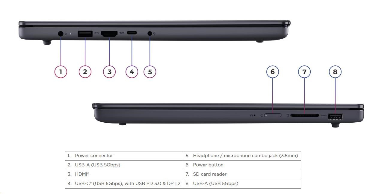 | Standartné porty | 2x USB-A (USB 5Gbps / USB 3.2 Gen 1) 1x USB-C® (USB 5Gbps / USB 3.2 Gen 1), with USB PD 3.0 and DisplayPort™ 1.2 1x HDMI® 1.4 1x Headphone / microphone combo jack (3.5mm) 1x SD card reader 1x Power connector |