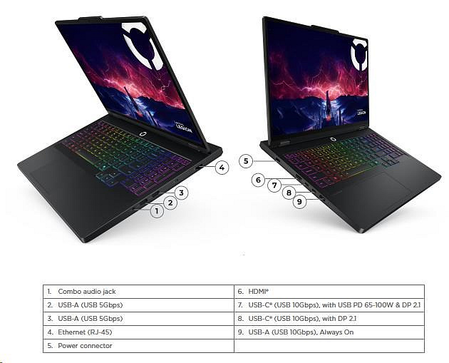 | Standartné porty | 2x USB-A (USB 5Gbps / USB 3.2 Gen 1) 1x USB-A (USB 10Gbps / USB 3.2 Gen 2), Always On 1x USB-C® (USB 10Gbps / USB 3.2 Gen 2), with DisplayPort™ 2.1 1x USB-C® (USB 10Gbps / USB 3.2 Gen 2), with USB PD 65-100W and DisplayPort™ 2.1 1x HDMI® 2.1, up to 8K/60Hz 1x Headphone / microphone combo jack (3.5mm) 1x Ethernet (RJ-45) 1x Slim tip Power connector |