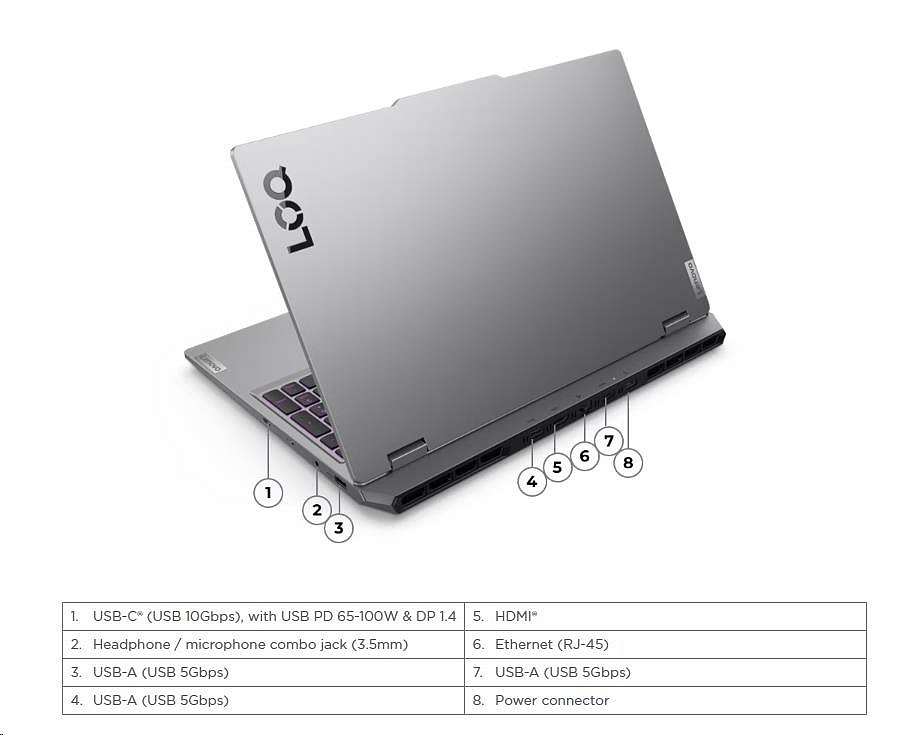 | Standartné porty | 3x USB-A (USB 5Gbps / USB 3.2 Gen 1) 1x USB-C® (USB 10Gbps / USB 3.2 Gen 2), with USB PD 65-100W and DisplayPort™ 1.4 1x HDMI® 2.1, up to 8K/60Hz 1x Headphone / microphone combo jack (3.5mm) 1x Ethernet (RJ-45) 1x Slim tip Power connector |