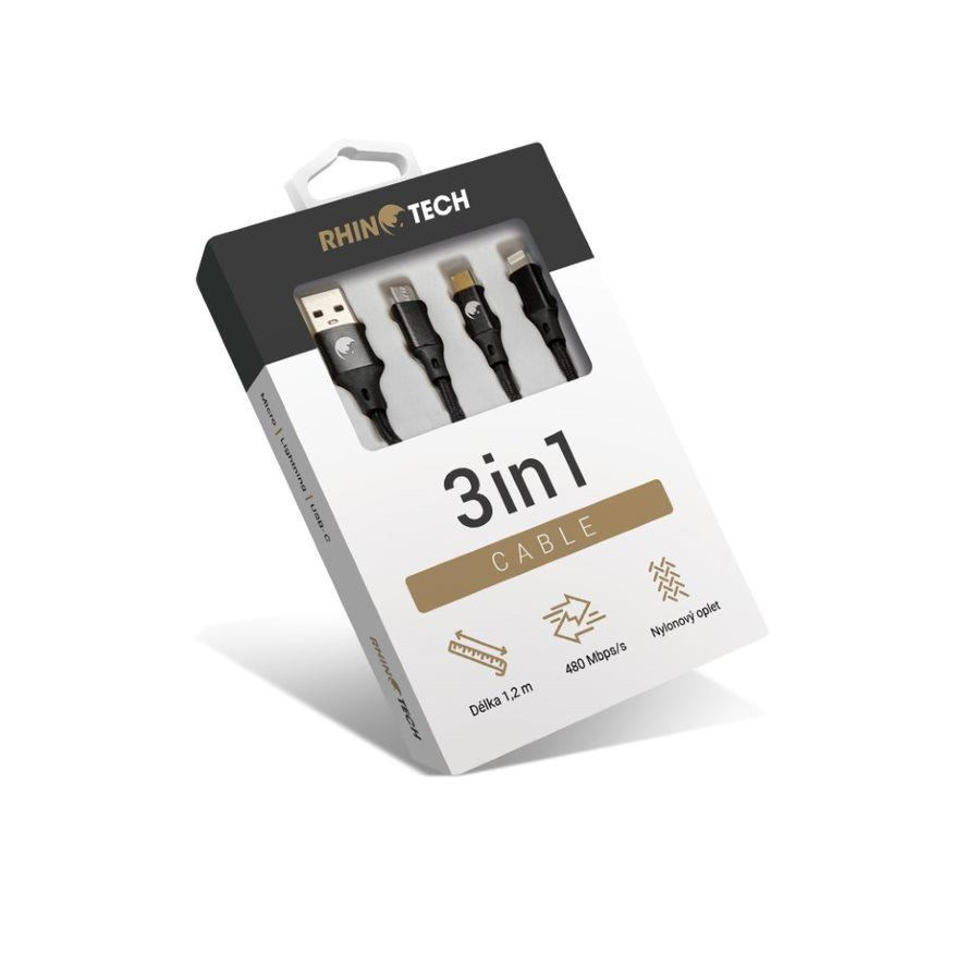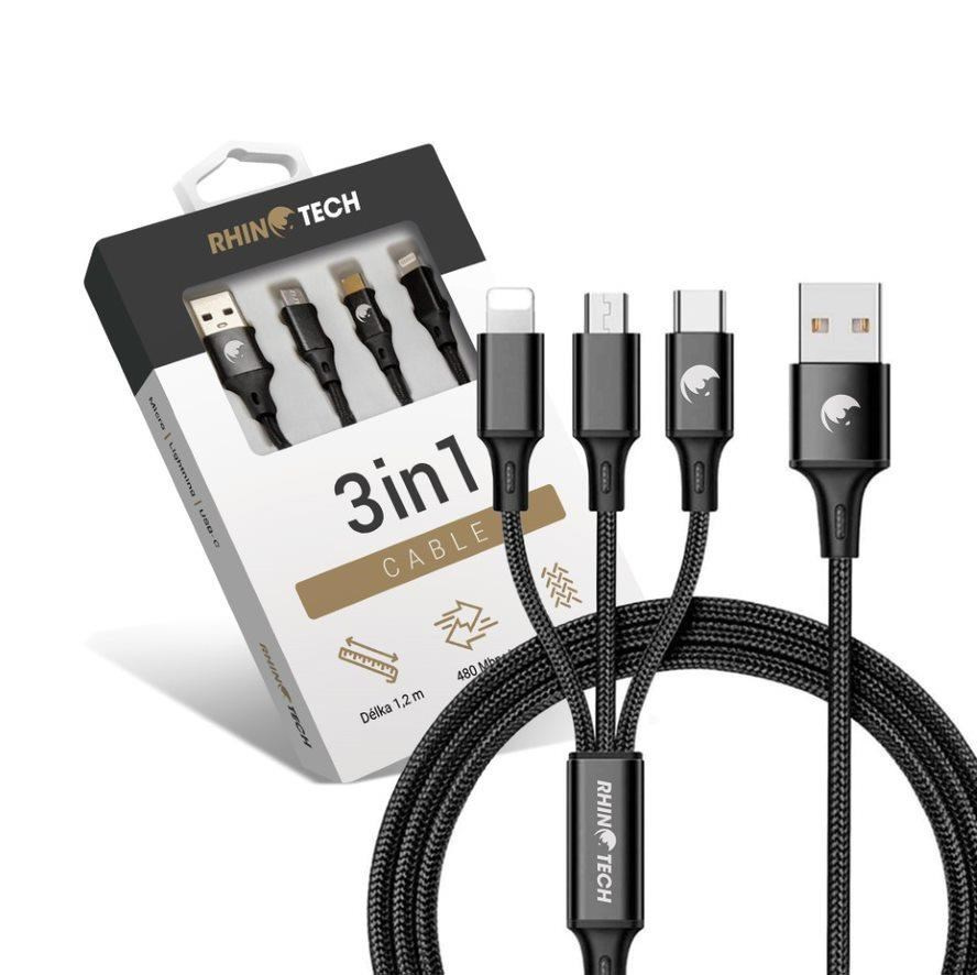RhinoTech nabíjecí a datový kabel 3v1 USB-A (MicroUSB + Lightning + USB-C) 1,2m, černá