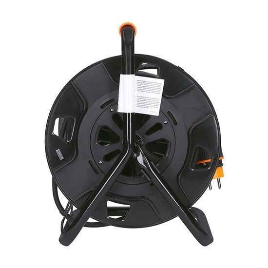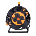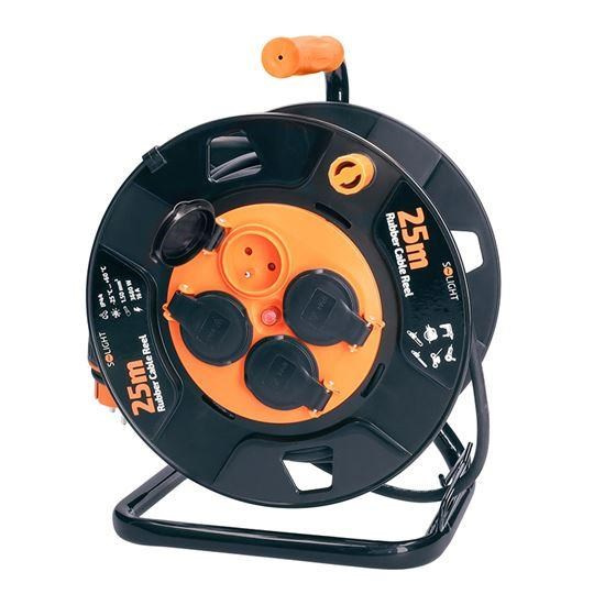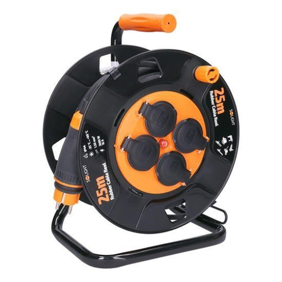 25m gumový kábel na bubne z odolného plastu a štyrmi zásuvkami je ideálny na použitie vonku, na záhradách, stavbách alebo v dielňach. Pevná konštrukcia s krytými zásuvkami aj samotný kábel sú odolné voči poveternostným podmienkam a mechanickému namáhaniu.