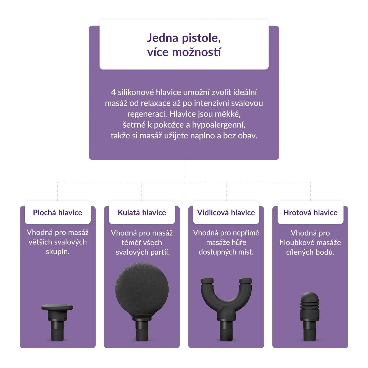 Vyberte si tú pravú. Štyri unikátne hlavice, ktoré sa prispôsobia každému svalu a každej nálade.