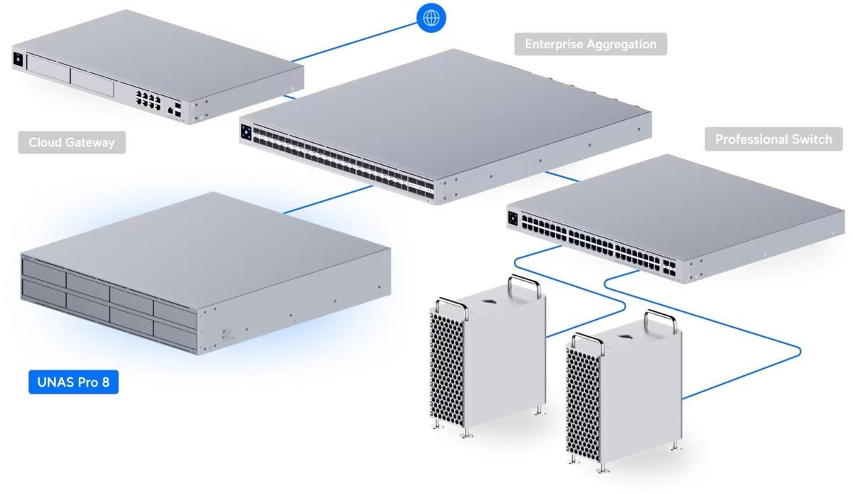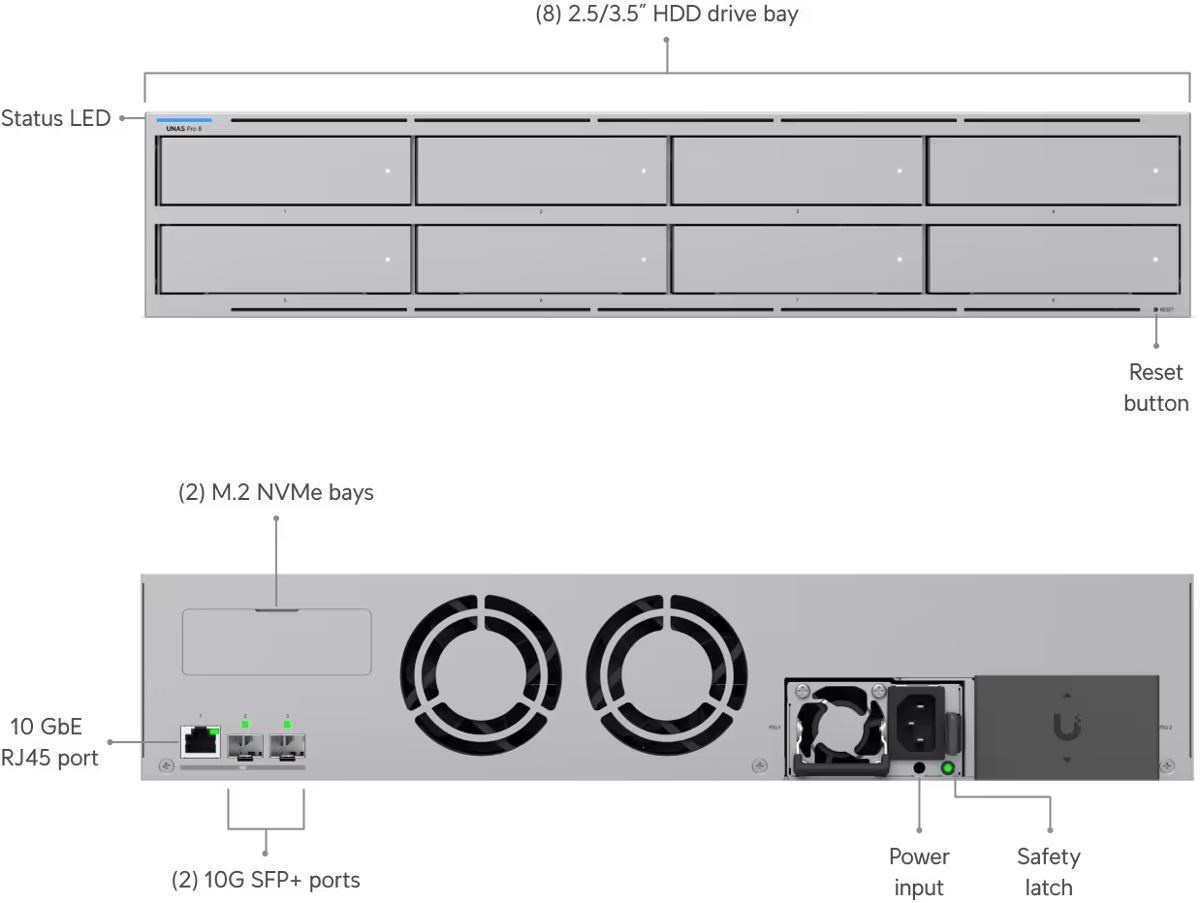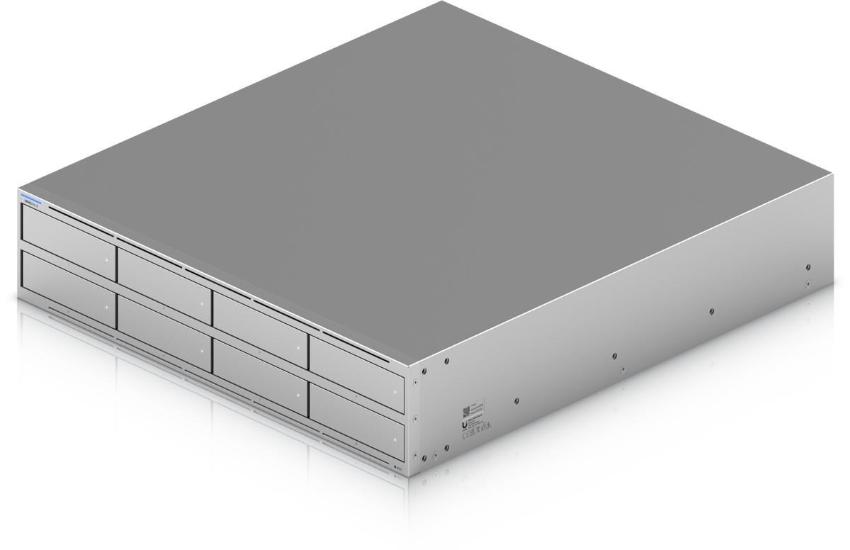 Popis produktu Síťové úložiště UniFi velikosti 2U pro montáž do racku s (8) pozicemi pro 2,5/3,5" pevné disky, (2) sloty pro M.2 NVMe SSD cache, (1) 10 GbE RJ-45 portem a (2) 10G SFP+ porty pro uplink. Poháněn je čtyřjádrovým procesorem ARM Cortex-A57, který je doplněný o 16 GB operační paměti. Disponuje dvěmi redundantními napájecími moduly s možností výměny za provozu. Obsah balení • Zařízení • Napájecí kabel a zdroj • Příslušenství pro montáž do racku Technické parametry Konektory a rozhraní Počet slotů pro HDD:8 Počet M.2 slotů:2 Rychlost LAN:(1) 100M/1G/2.5G/5G/10G Gigabit LAN:Ano Optické rozhraní:(2) 10Gbps Ostatní:Bluetooth Napájení Typ napájení:Ze sítě (230V) Redundantní napájení:Ano Max. spotřeba energie [W]:250 Napájení přes konektor/svorkovnici:230V AC Fyzické charakteristiky Provedení:Rackmount Materiál:Ocel Počet "U" pozic:2 LED indikace:Ano Provozní teplota [°C]:-5 až 40 Hmotnost [kg]:11,5 Šířka [mm]:442 Výška [mm]:87 Hloubka [mm]:480 Hardware Velikost operační paměti [GB]:16 CPU:ARM Cortex-A57.
