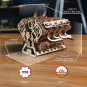V8 Engine je model v mierke 1:6, ktorý funguje buď pomocou elektromotora, alebo otáčaním gombíka, čo vám umožní sledovať fascinujúce fungovanie tohto ikonického spaľovacieho motora. Model presne zobrazuje všetky hlavné mechanizmy skutočného osemvalca, vrátane ôsmych valcov s rytmicky sa pohybujúcimi piestami, pričom dva valce „výstrelí“ na každých 90 stupňov otáčky kľukového hriadeľa, 16 ventilov s pružinami, ktoré sa otvárajú a zatvárajú, ako ich tlačia hlavy na rotujúcich vačkových hriadeľoch, komponenty kľukovej skrine a ventilového rozvodu spojené s rozvodovým reťazcom a škrticou klapkou na sacom potrubí. Model je poháňaný elektromotorom stylizovaným ako generátor. Hadovitý retiazkový remeň spája remenic kľukového hriadeľa s ostatnými remenicami spájajúcimi príslušenstvo motora, ako je klimatizácia, alternátor, čerpadlo posilňovača riadenia a vodná pumpa. Pripojte model ku zdroju napájania pomocou kábla USB-C, potom zapnite vypínač a sledujte, ako motor ožíva, alebo ručne uvádzajte motor V-8 do pohybu otáčacím gombíkom umiestneným pod vypínačom.